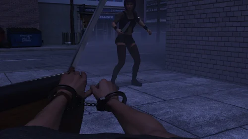Your hands are cuffed, and two dead bodies are lying around.